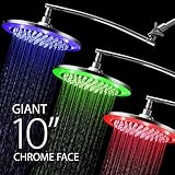 - Giant 10 inch LED Rainfall Shower Head with Reflective Chrome Face and LED Perimeter Rim is Powered by running water, no batteries. Color of LED lights changes automatically according to water temperature and LED lights have long life of 100,000 hours (over 10 years of heavy daily use)