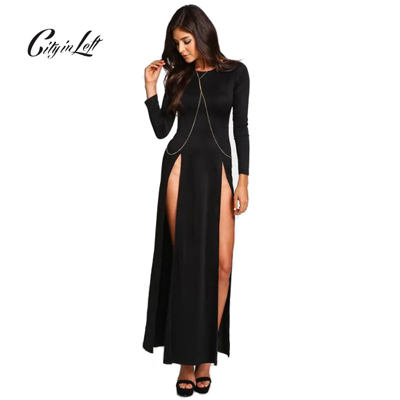2016 neue Frauen Kleid Sexy Club Hoch Split Kleid Langarm schwarz Doppel Hohe Schlitz Schlank Maxi Partykleid Mode Kleid NC-465