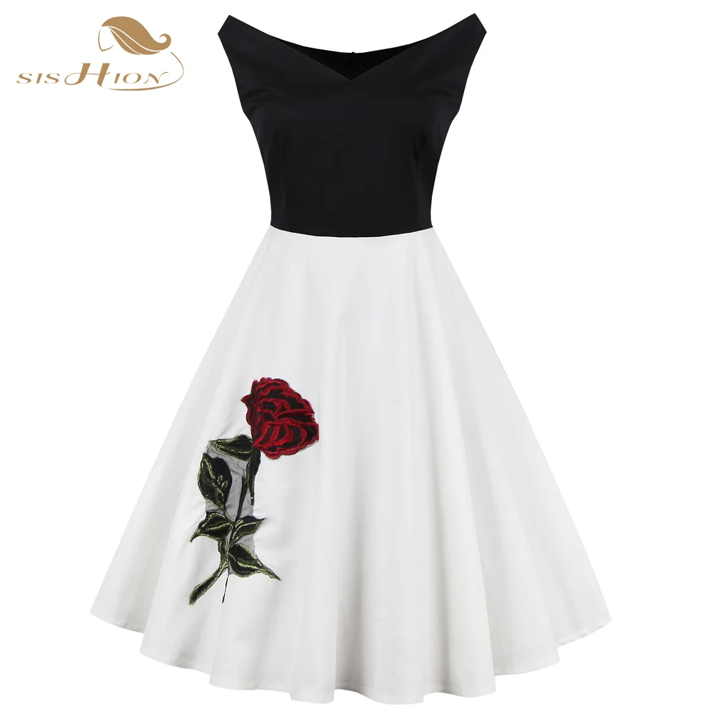 Blumendruck Stickerei Elegante Kleid 2016 Neue Sommer Frauen V-ausschnitt Schwarz und Weiß Kleid Plus Size Schaukel Vintage Kleider (ohne Petticoat)