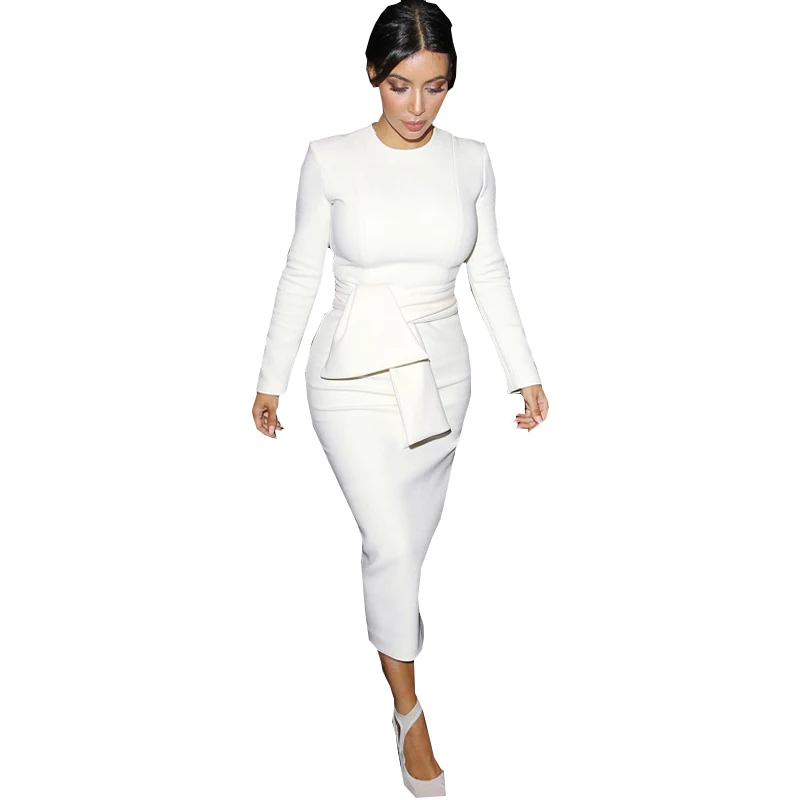 buy-now Damenmode Kurze Einfarbig Belted Ruched Long Sleeve Elegante Wei Casual Mantel Bodycon Bleistift Bro Midi-kleid
