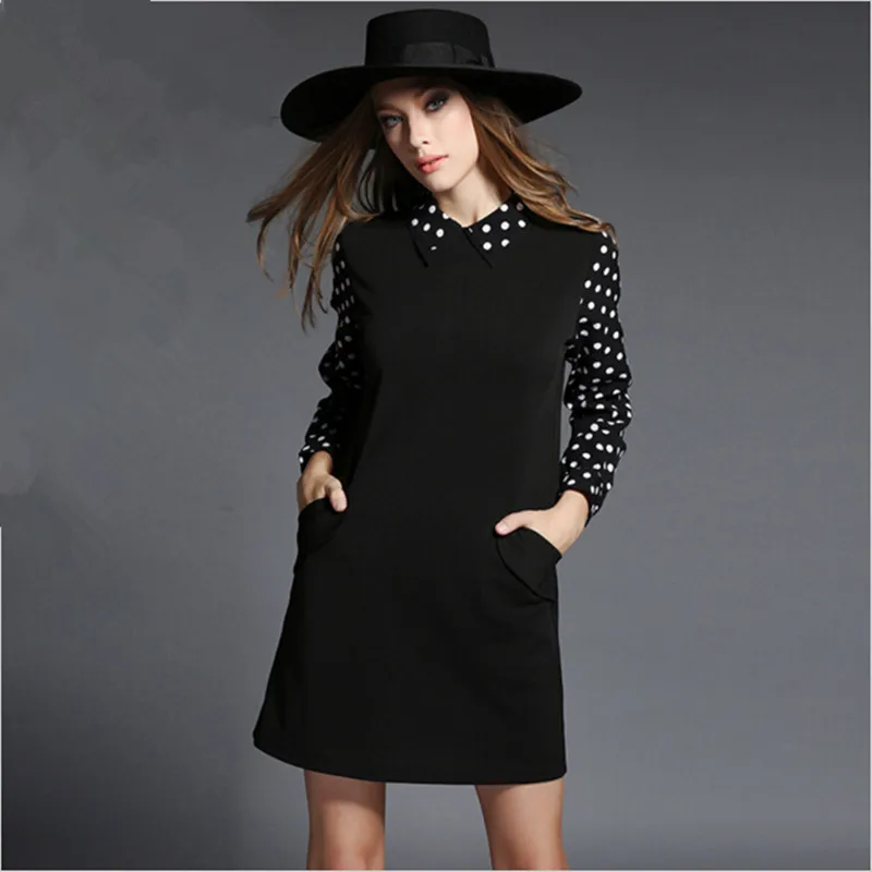 Euro Stil 4XL Plus Gre Frauen Schwarz Kleid Herbst Winter 2016 Vestidos Langarm Casual Lose Dot Kleid Roupas Femininos 51440