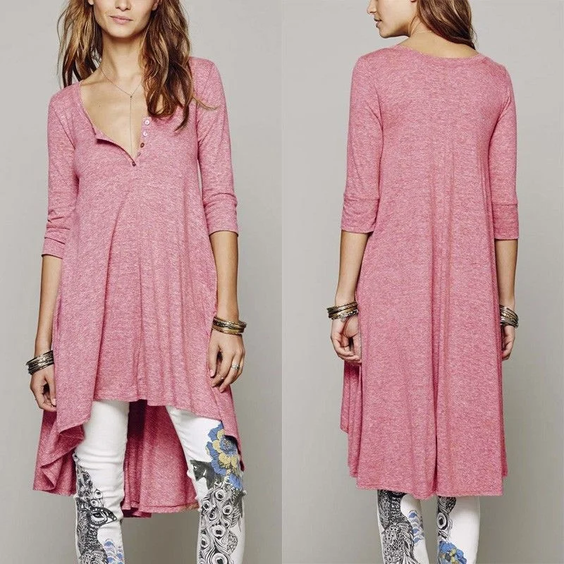 Frauen Sommer Frhling Beilufige Boho Sexy V-ausschnitt Tasten Lange Tops Asymmetrische Maxi 3/4 Hlsen-minikleid Plus Size Solide wei/Rosa