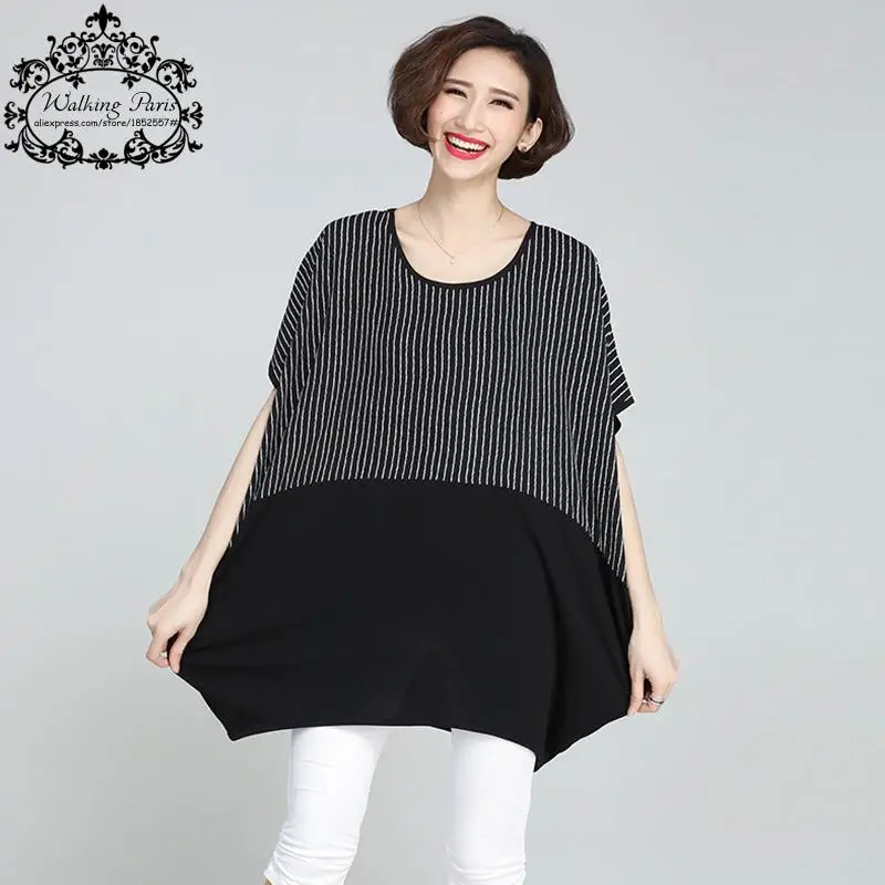 Plus Gre Frauen T-Shirt Sommer Baumwolle Gestreiften Print Patchwork Tops Casual Fashion Lady T-shirt Kleid Flgelhlse Schwarze Kleidung