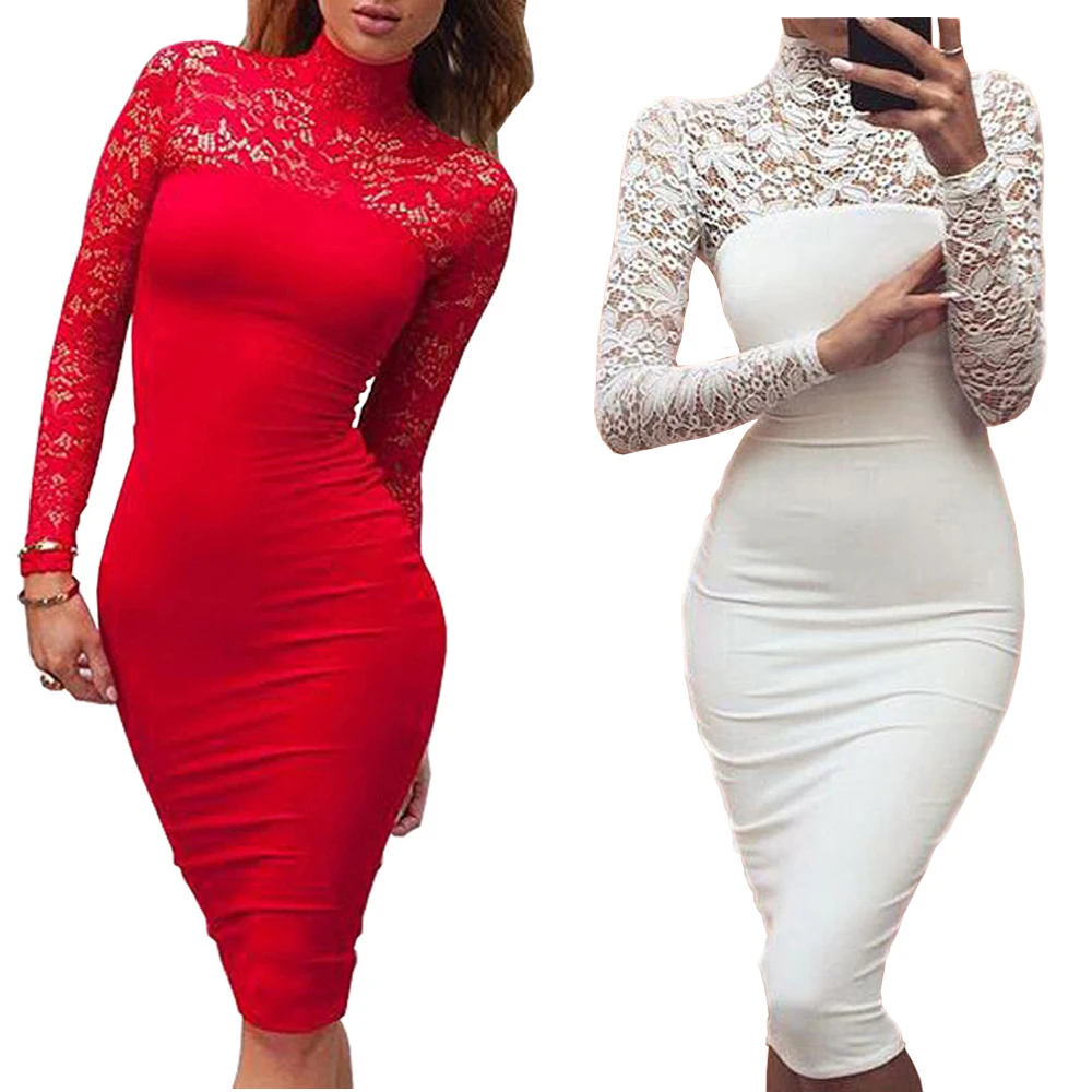Rollkragen Langarm Spitzen Midi Sexy Club Verband Bodycon Kleid 2016 Herbst Wei Rot Schwarz Frauen Elastischen Eleganten Party Kleider