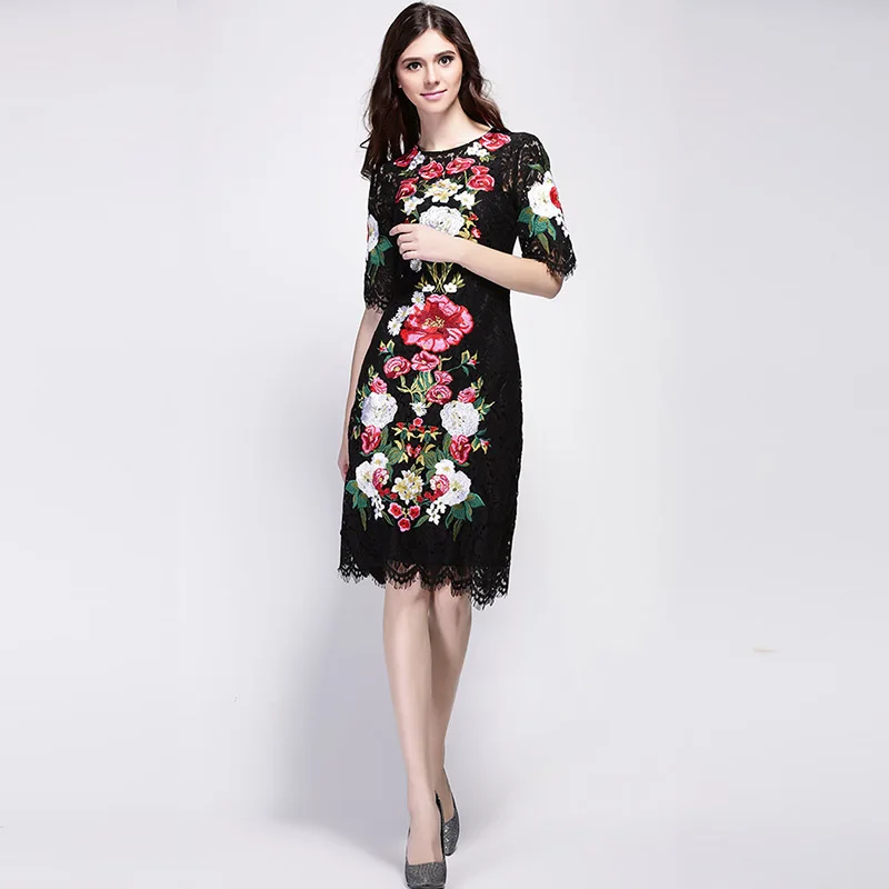 Runway Kleid 2016 Frauen Berhmte Marke Kleid Stickerei Elegante Kurzarm knielangen Dnne Kurze Spitze Schwarz Kleid