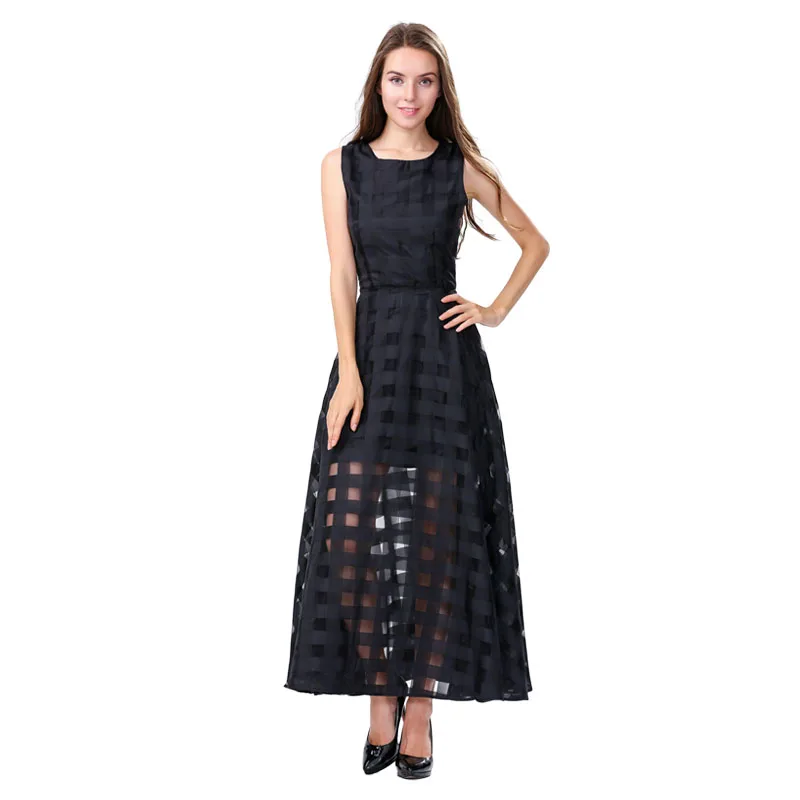 2016 Maxi Sommer Plaid Frauen Kleid Neue Lange Organza Tag Kleid Vestidos De Festa Satin Fashion Style Schwarz Frauen Kleider