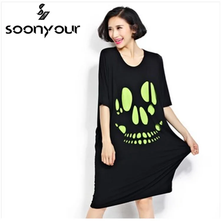buy-now 2016 sommer neue Europische und Amerikanische mode druck groe gre frauen lose kurzarm schwarz dunkelgrau kleid 82941
