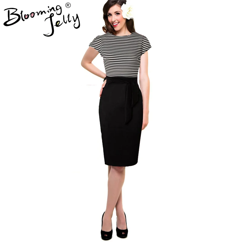 buy-now Blhende Gelee Jahrgang 50 s Kleider Schwarzweiss-streifen Druck Patchwork Frauen Kleid Bro Retro Hohe Taille Bleistift Arbeit kleid