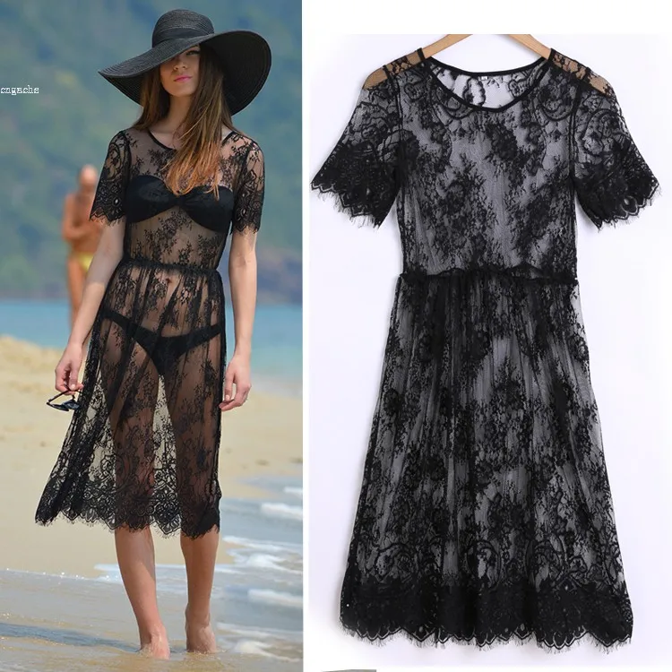 buy-now Frauen SPITZE Midi Kleider Casual Langen Schwarzen Kurzarm O Neck Durchsichtig Strand Tragen Spitze Sexy Kleid Plus Gre S-XL