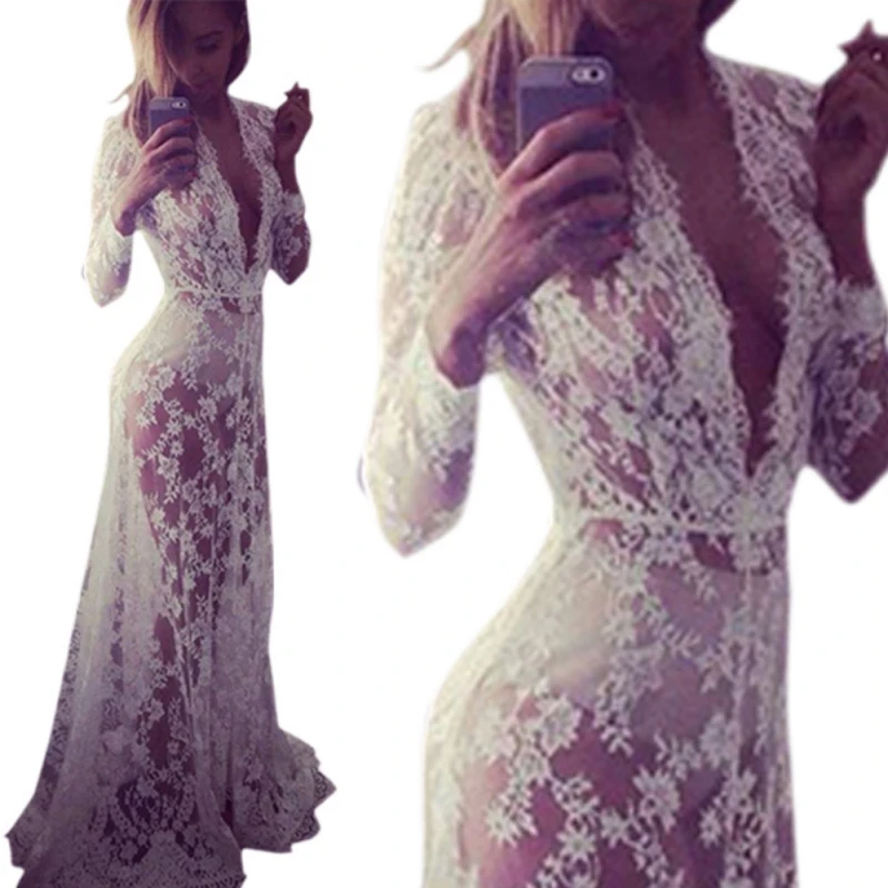 buy-now Freies Verschiffen Sommer Kleider Frauen Bodenlangen Schwarz Wei Spitzenkleid Einstellen Taille Sexy Durchsichtig Floral Vestido DR5046