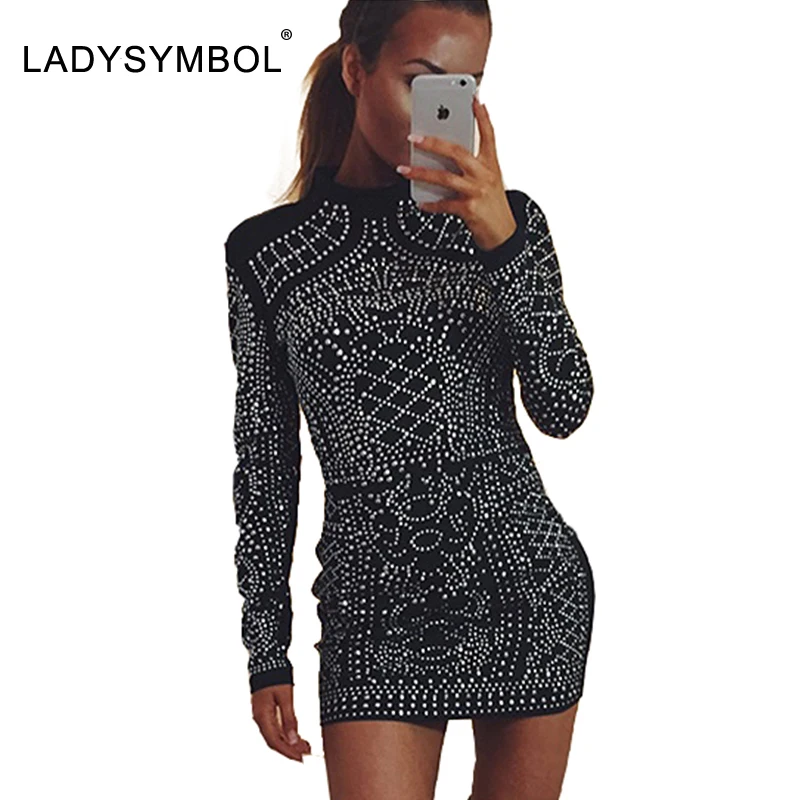 buy-now Geometrische Retro Strass Herbst Kleider 2016 Langrmelige Casual Schwarz Sexy Club Bodycon Kleid Mini Winter Party Kurze Kleider