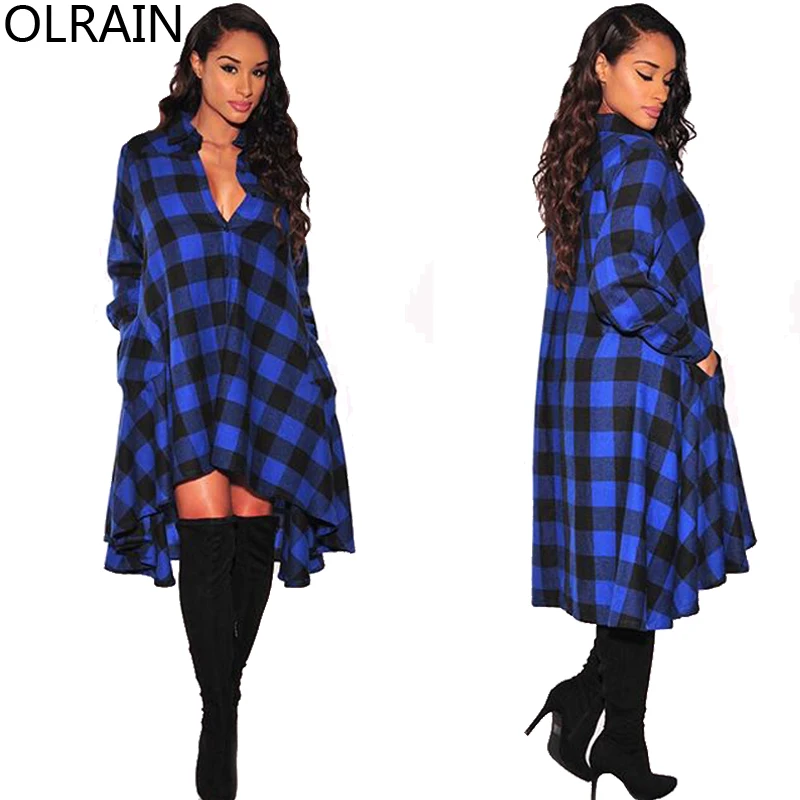 Olrain Damenmode Blau Schwarz Plaid Oversize Lose Asymmetrische Langarm T-shirt Kleid Beilufige Lose Bluse Tops