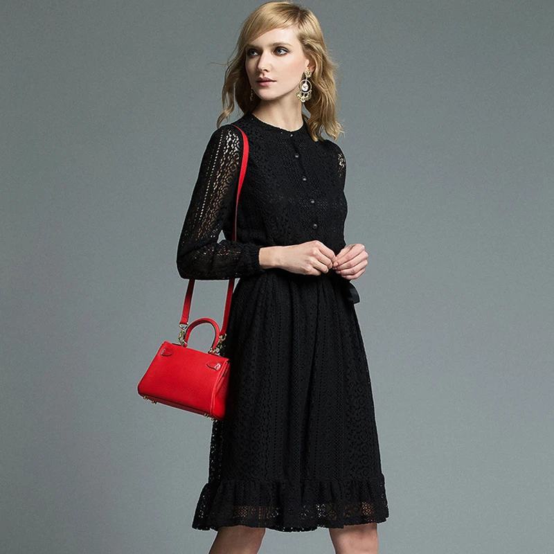 Frhling 2016 kleid langarm t-rugby-t-shirt haken blume aushhlen dnne spitze kleider weibliche schwarze faltete elegantes kleid fr frauen CQ0114