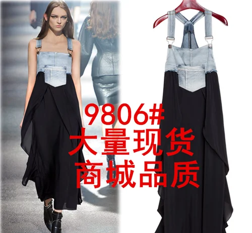 New Frauen Langes kleid Rschen Lose Chiffon-Fat Hosentrger Cowboy Stellte Kleider Khaki Schwarz Navy 9806