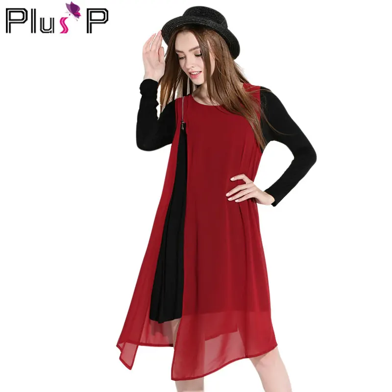 PP Plus Groe Gren Frauen Kleidung Neue 2016 Herbst Winter Langarm Elegante Schwarze Beilufige Chiffon Kleid Outfits FP00879