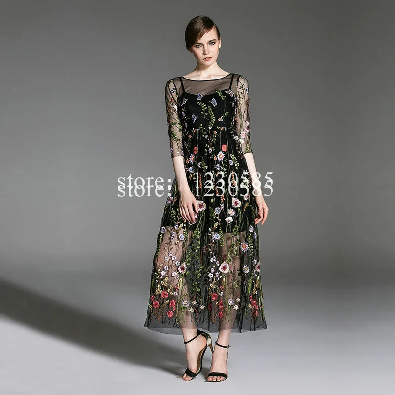 Runway Kleider 2016 Schwarz Halbarm Sheer Mesh Stickerei Lange Kleider Bhmischen Marke Stil Vestidos De Festa 62878