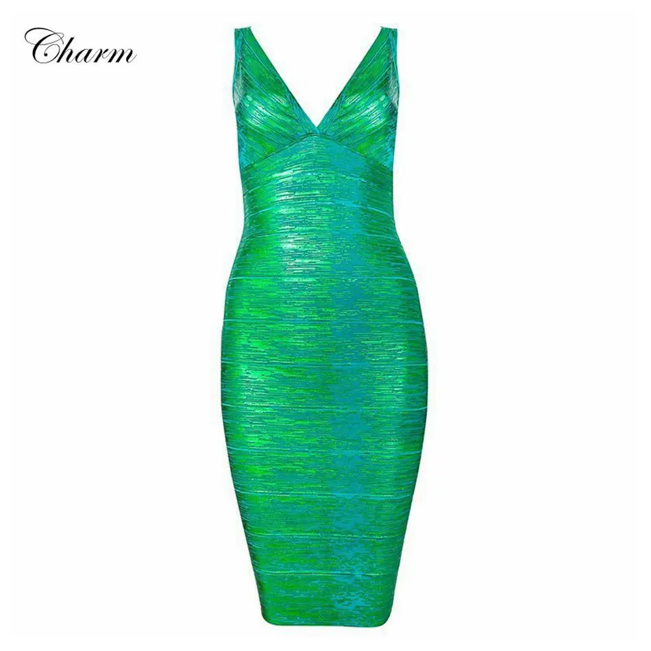 Auf Lager Hoher Qualität Neue V-ausschnitt glänzende metallischen Folie-Print Bandage-kleider gold rot grün schwarz Bodycon kleid
