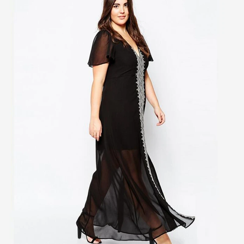 buy-now Frauen Schwarz Maxikleid 2016 Sommer Vintage Gedruckt Sexy Lace Kleider Kurzarm V-ausschnitt Plus Gre Femme A-Line Vestidos DR258