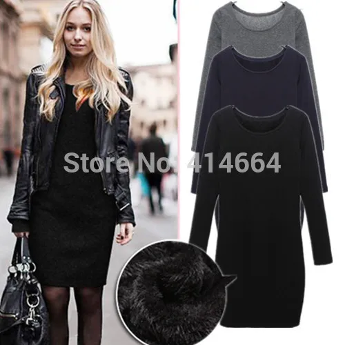 buy-now Neue 2015 Herbst Und Winter Samt einteiliges Kleid Mode Beilufige Dnne langhlse Grundlegendes Kleider Schwarz Grau Plus Gre XXL