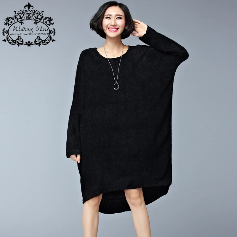buy-now Plus Gre 2016 frauen Kleider Schwarze Lange Tops & Tees Woolen Flgelhlsen berma Lose Mode Herbst Groe Gre dame Kleid