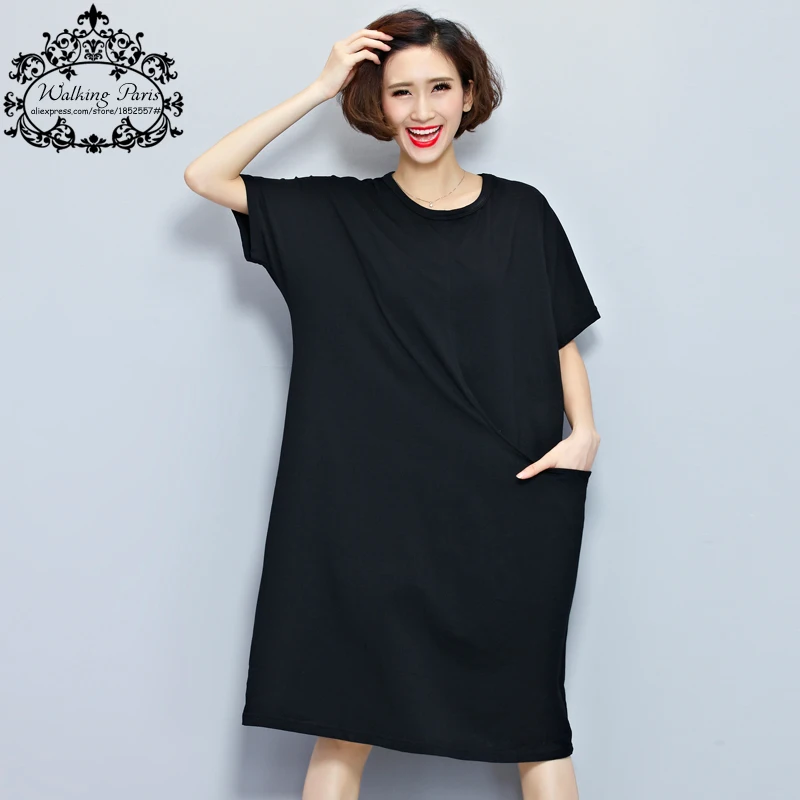 buy-now Plus Gre Frauen Kleid Sommer Stil T-Shirt Baumwolle Solid Print lange Tops Casual Weibliche Elastische T-shirt Gre Schwarz kleider