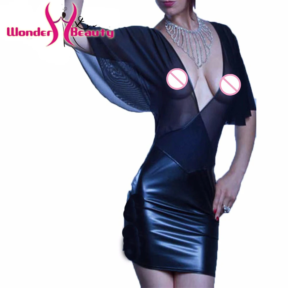 Plus Gre Sommer Sexy Schwarz Club Vinyl Kunstleder Kleid Heier Vestidos Backless Tiefem V-ausschnitt Mini Bodycon Nachtklub-kleid W860707