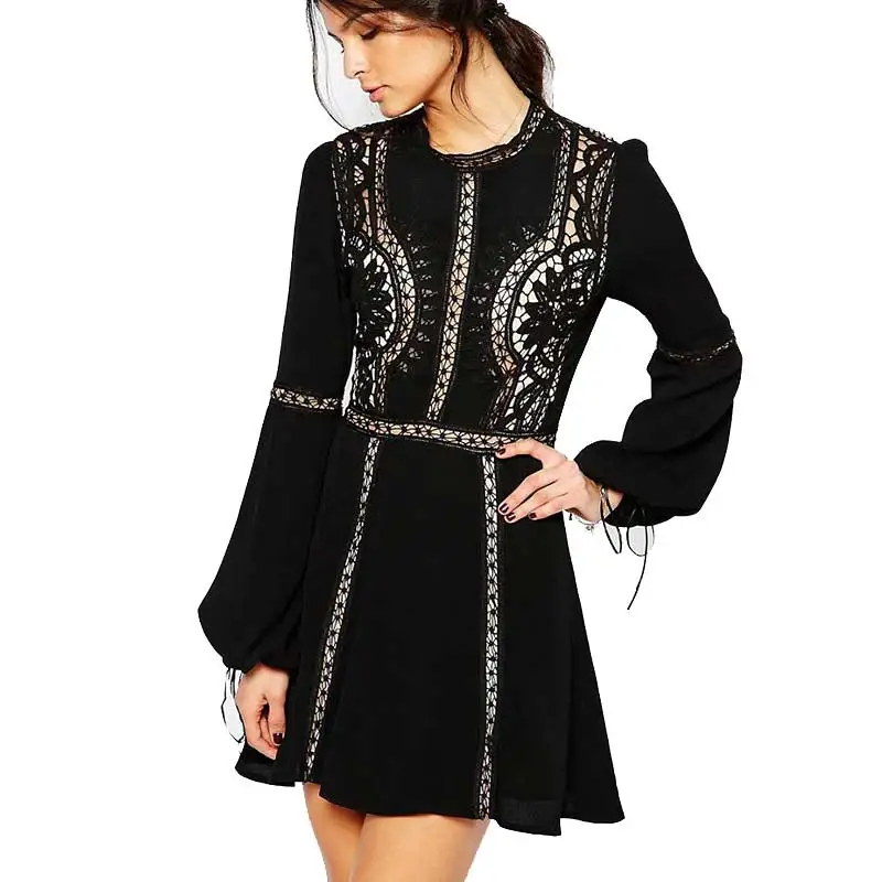Schwarz kleid frauen kleid sommer/herbst elegante lange hlse O-ansatz mini femail vestido vintage boho hippie chic marke kleidung