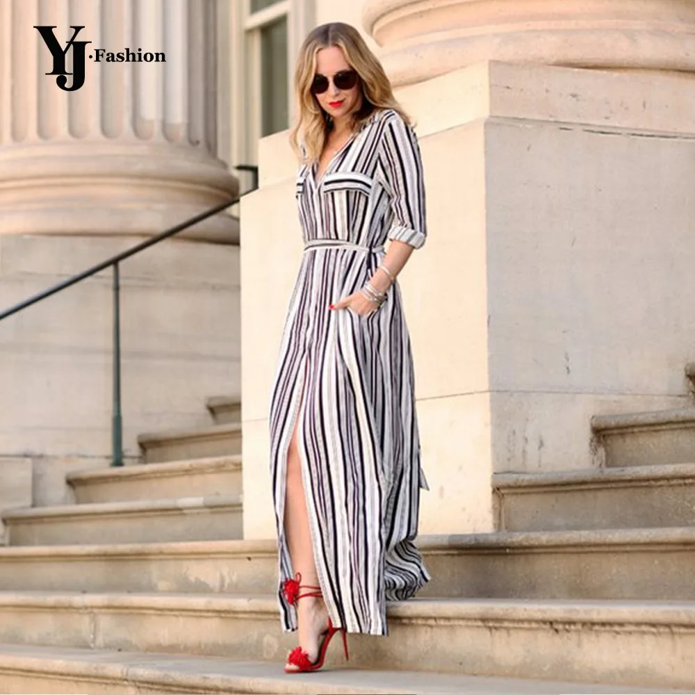 buy-now Schwarz-wei Gestreiften Maxi Shirt Kleid Lange Elegante Maxi Party Kleider Hohe Split Sexy Maxi Krawatte Taille Tunika Kleid