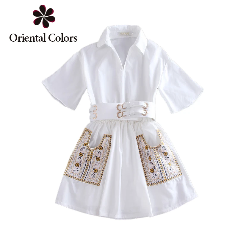 buy-now Sommer Mini Shirt Kleid Bestickt Weien Grtel Tunika Bettwsche Umlegekragen Kurzarm Hohe Qualitt Sexy Frauen Sommerkleid