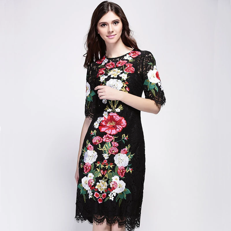 Spitzenkleid 2016 Frhling Sommer Neue Fashion Runway Marke Blumen Stickerei Luxus Kurzarm knielangen Schwarzen Kleid
