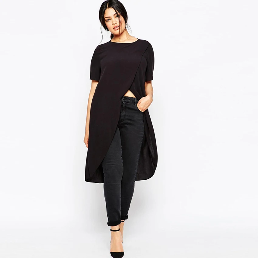 buy-now 2015 frauen Plus Gre Kleider 4XL 5XL Vorderseite Kreuz Hohe Split Schwarz Casual T-shirt Kleid Kurzarm Designer Street Vestidos