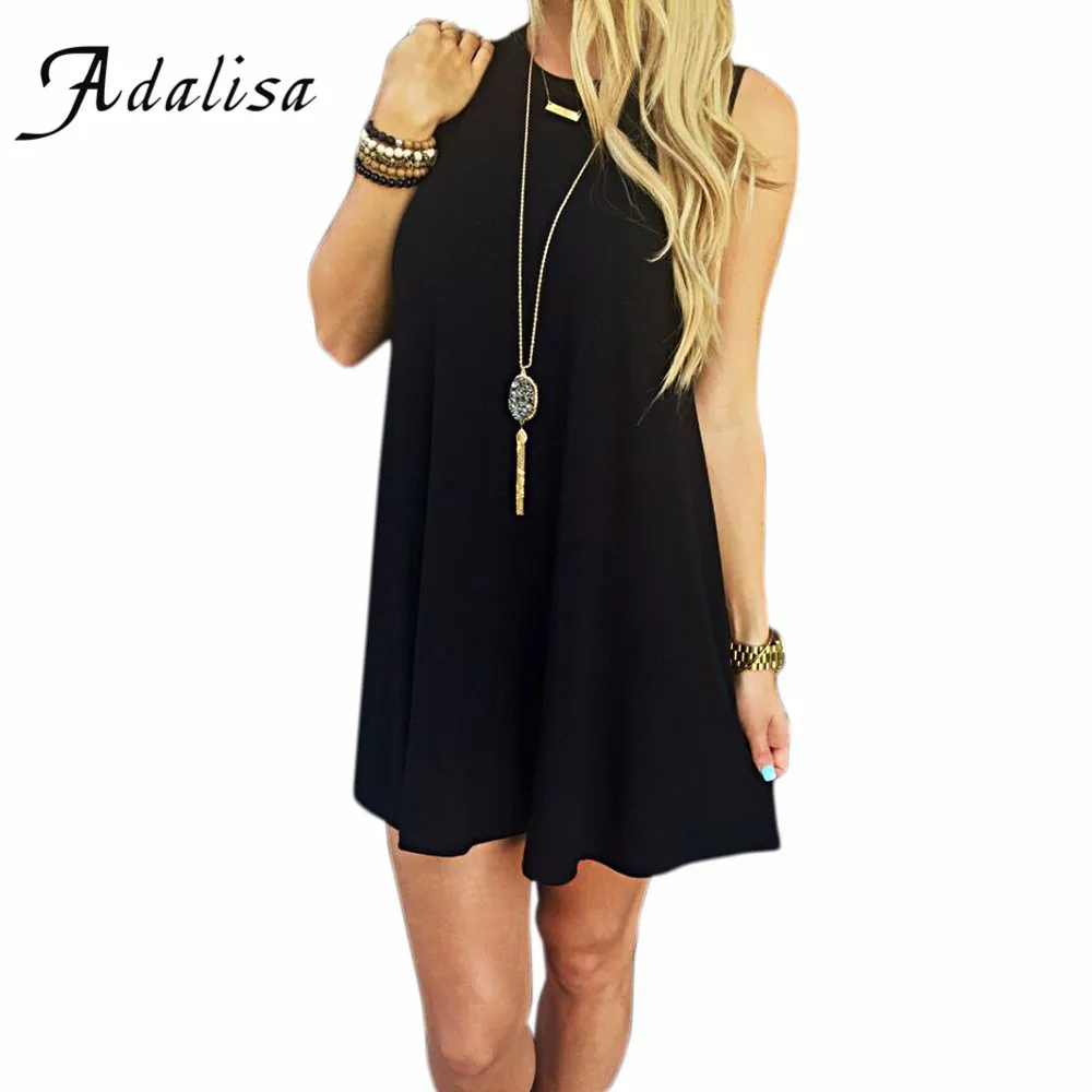buy-now Casual Schwarz Einfarbig Lose Kleider Frauen Sommerkleid Rundhals Sleeveless Patchwork Sexy Mini Kleid Fr Damen Kleidung