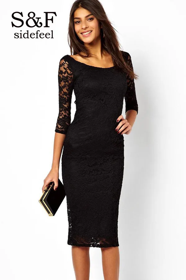 buy-now Hbsche Dame Black Lace Overlay Abend Midi Kleider LC6287 2016 Herbst Kleid Fr Frauen Vestidos Femininos Lssige Etuikleider