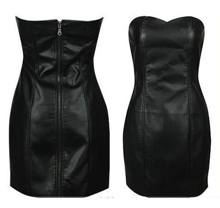 buy-now Schwarz Kunstleder Bleistift Bodycon Boob Trgerlosen Mini Skater Kleider Sommer Reiverschluss Frauen Clubwear Midi Sexy Kleid Shapewear