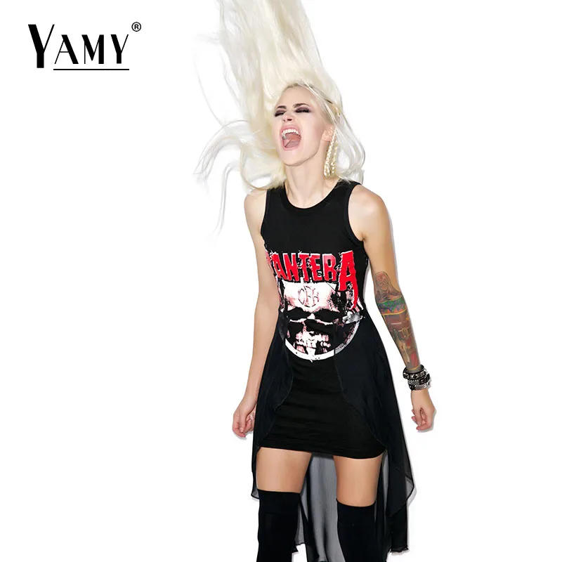 sommer neue frauen kleid 2016 metallplatte Rock & Roll Pantera hemd kleid Schädel Totem druck unregelmäßigen schwarzen kleid vestido de festa
