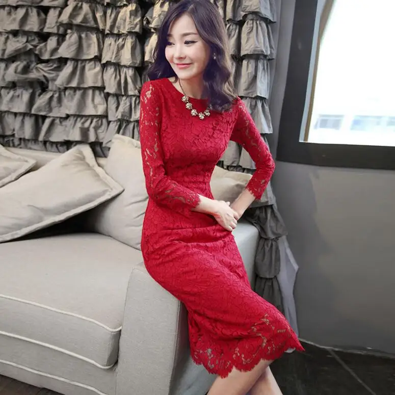 buy-now 2016 frhling Spitze Frauen Midi Kleid Volle Hlse Sexy O-ansatz Aushhlen Elegante Bodycon Wei/Rot/Schwarz Kleider vestidos femininos