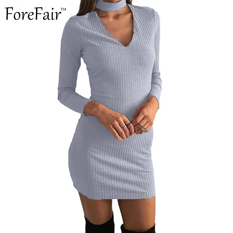 buy-now 95% baumwolle Grau Schwarz Frauen Casual Kleid Herbst Winter Stil Warme Langhlse Dnne Aushhlen V-ausschnitt Bodycon Mini kleider