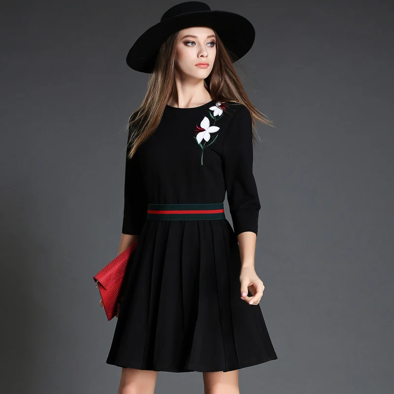 elegante Frauen Herbst Kleid 2016 Neue Art Und Weise Faltete Schwarz T-shirt Kleid Stickerei Casual Kleid Ropa Mujer Vetement Femme 71860