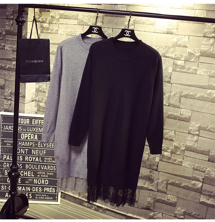 buy-now Hohe qualitt 2016 neue frauen winter schwarz gery pullover kleid patchwork spitze lang strickpullover kleider heier verkauf