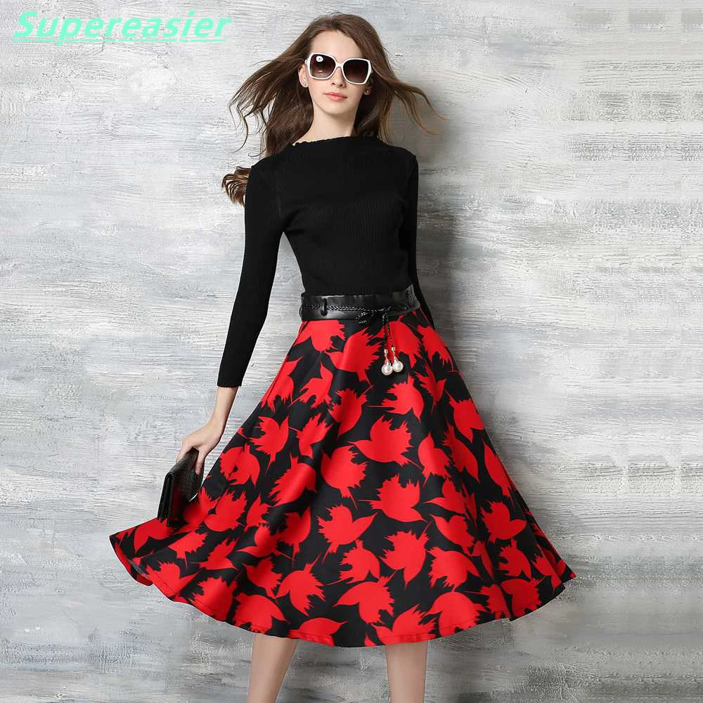 buy-now Mode 2016 Sommer Herbst Frauen Pullover Kleid Schwarz Oansatz Langarm Midi Kleid Blumendruck Reich Schaukel Kleid mit Schrpen