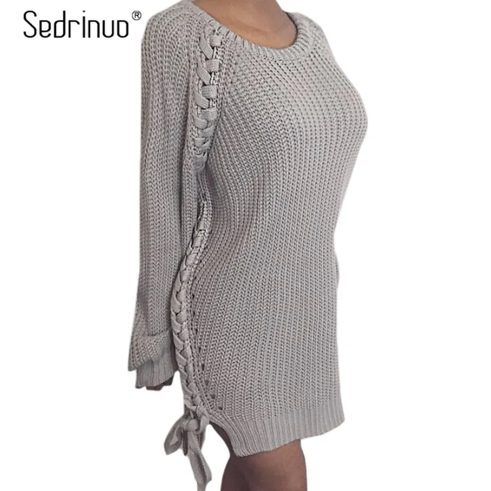 buy-now Sedrinuo Winter Beilufigen Losen Langarm Rundhals Strickpullover Kleid Fashion Lace up Side Split Grau/Schwarz Pullover kleider