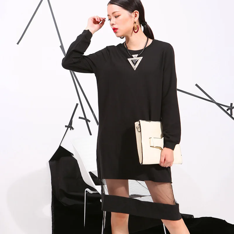 buy-now [Soonyour] 2016 heier verkauf langes kleid frauen herbst mesh langarm asymmetrische nhte schwarze kleider senden punktwaren 40001