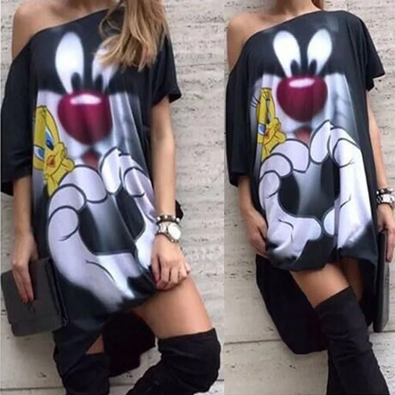 buy-now Vetement Femme Frauen Sommerkleid 2016 Mode Cartoon Nette Druck Lsen Kleid Schwarz Ukraine Vestido Sexy Mujer Plus Gre