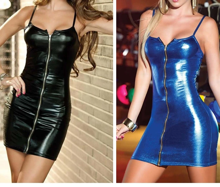 buy-now 2016 hohe Qualitt Frauen Nachtclub Kleid Sexy Kunstleder Metall Reiverschluss Khlen Engen Schwarzen Blaue Hosentrger Club Kleid Kleidung