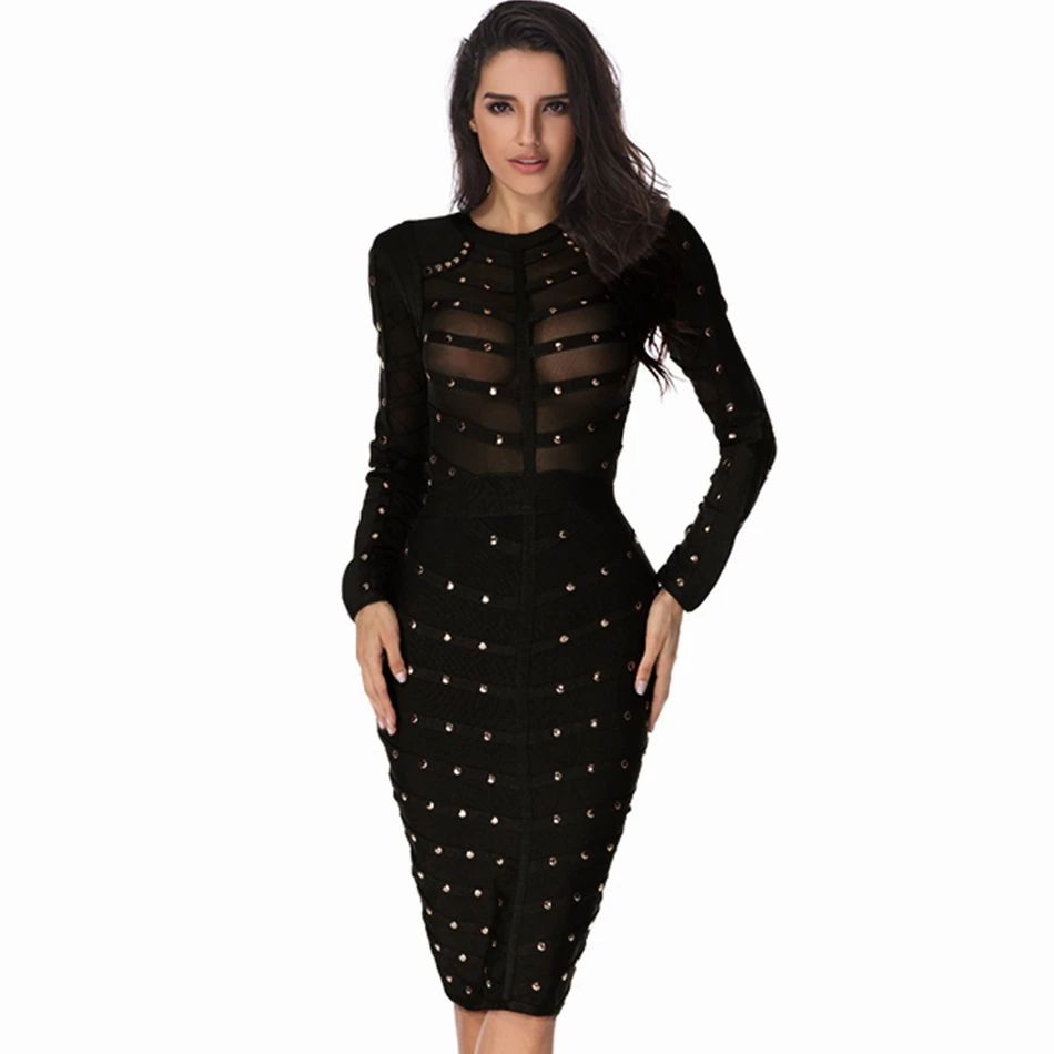 Grohandel 2016 Neue Sexy Frauen Kleid Mesh Verzierte Taste Olive Rot Schwarz High Neck Bodycon Kleid Promi-party Bandage Kleider