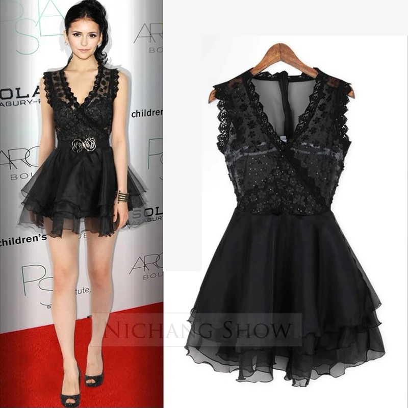 buy-now Sommer Kleid 2016 Mini Spitze Vestidos Tiefem V-ausschnitt schlanke Taille Appliques Sheer schwarz kleid frauen Kleider Brautjungfern Party