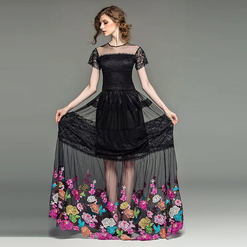 buy-now Vintage Kleid 2015 Mode Frauen Marke Kleider Kurzarm Mesh Heavy stickerei Schwarz Lange Kleider